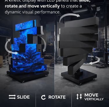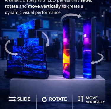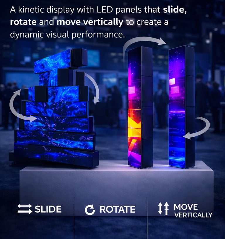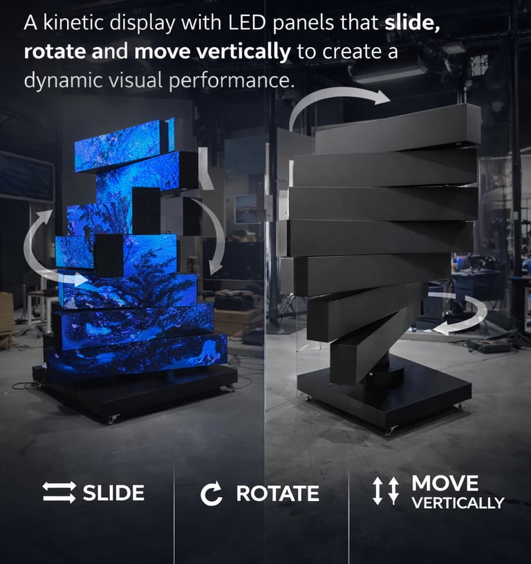 شاشة LED متعددة تتحرك أفقياً وعمودياً مع إمكانية الدوران، لعرض محتوى متغير بشكل ديناميكي وجذاب.