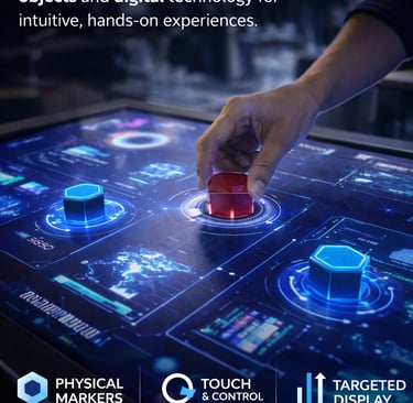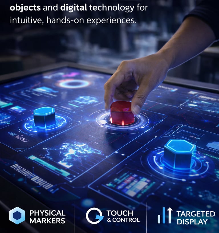طاولة تفاعلية تدمج بين اللمس والعناصر الفيزيائية، حيث يمكن للمستخدم تحريك عناصر حقيقية للتحكم بالمحتوى الرقمي.